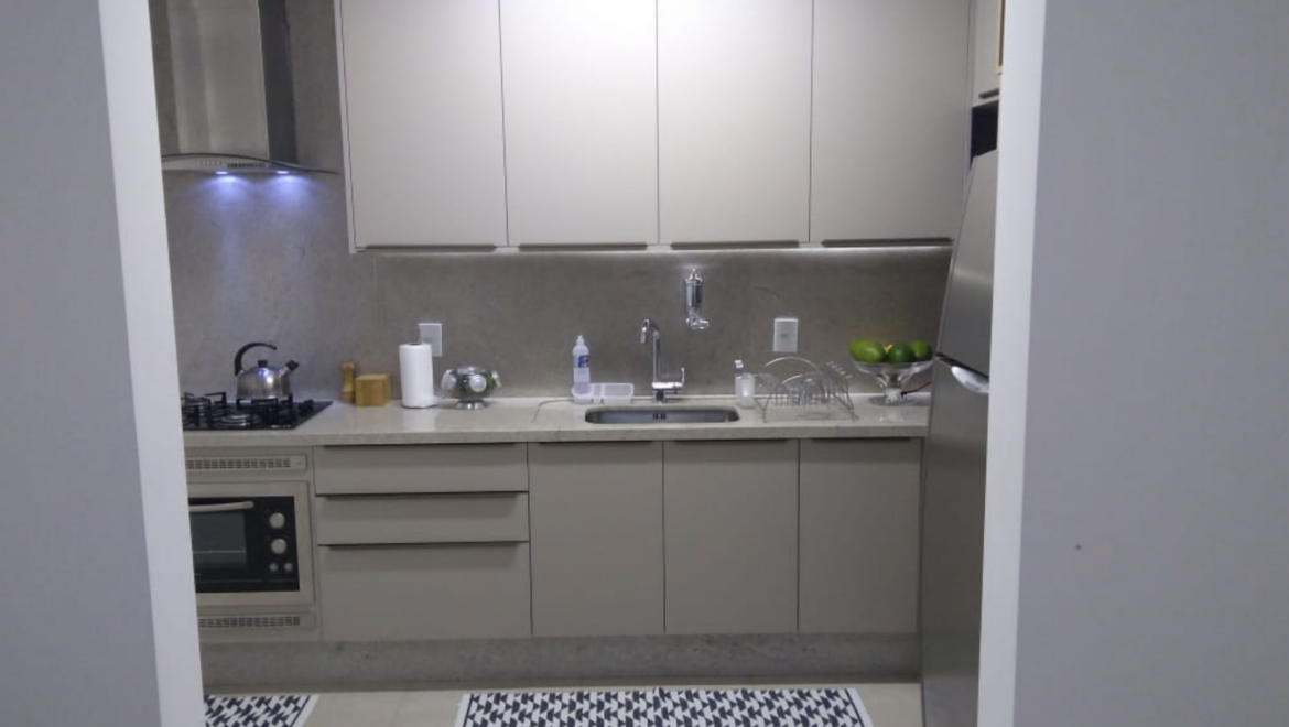 O apartamento está semimobiliado, com móveis planejados de alto padrão, e oferece: