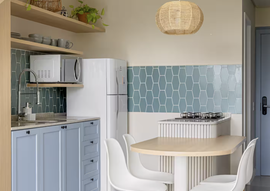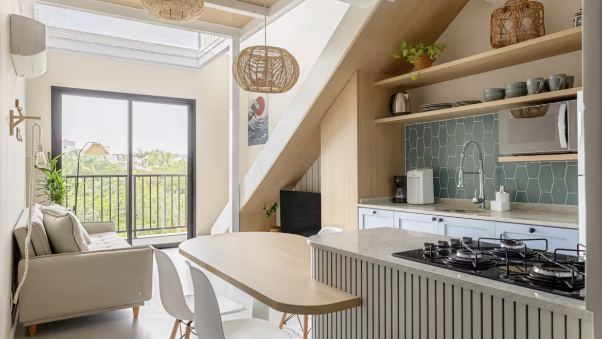 Primeiro Nível: Sala de estar/TV integrada à cozinha americana, banheiro social e varanda privativa — o espaço perfeito para receber e relaxar.
