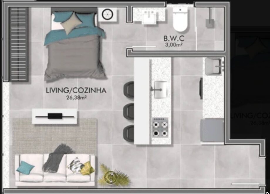 Com 32,68 m² muito bem distribuídos, o imóvel oferece um ambiente integrado de sala, quarto e cozinha, criando uma atmosfera moderna, funcional e acolhedora — ideal para quem busca um refúgio próximo à praia, um espaço para uso próprio ou uma excelente oportunidade de investimento em locação.